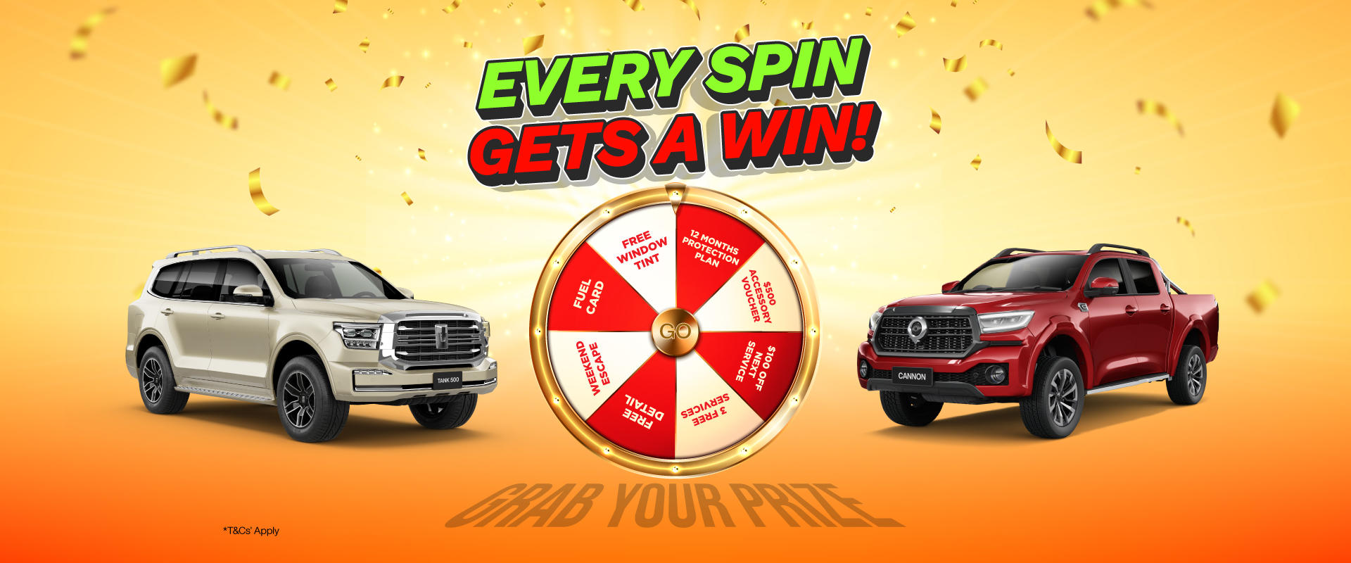 - Prizes requiring a vehicle purchase: Free Window Tint, 12 Months Protection Plan, $500 Accessory Voucher, $2,000 Trade-In Bonus, and more.